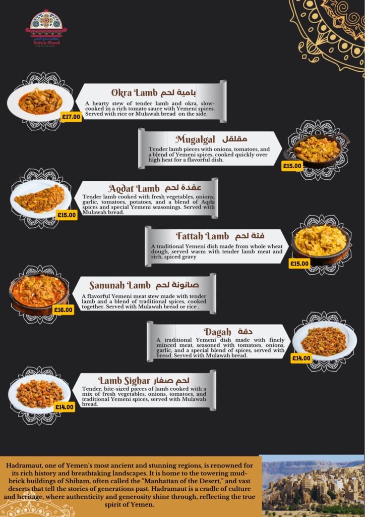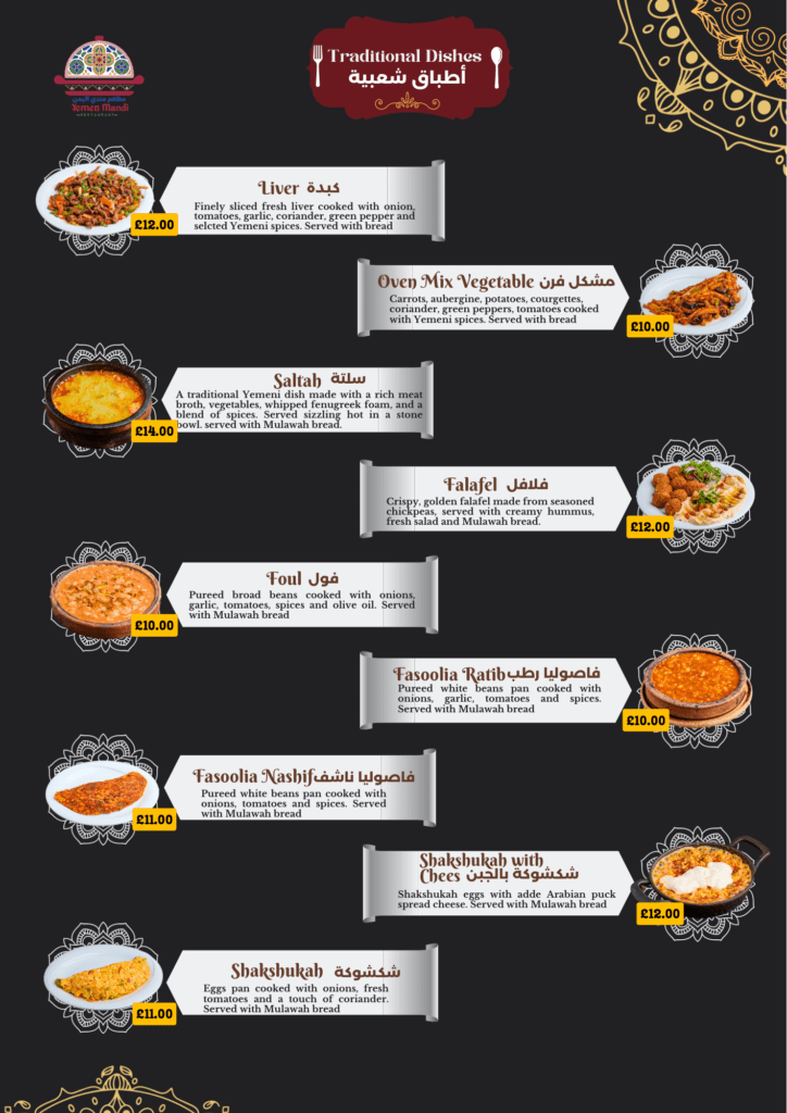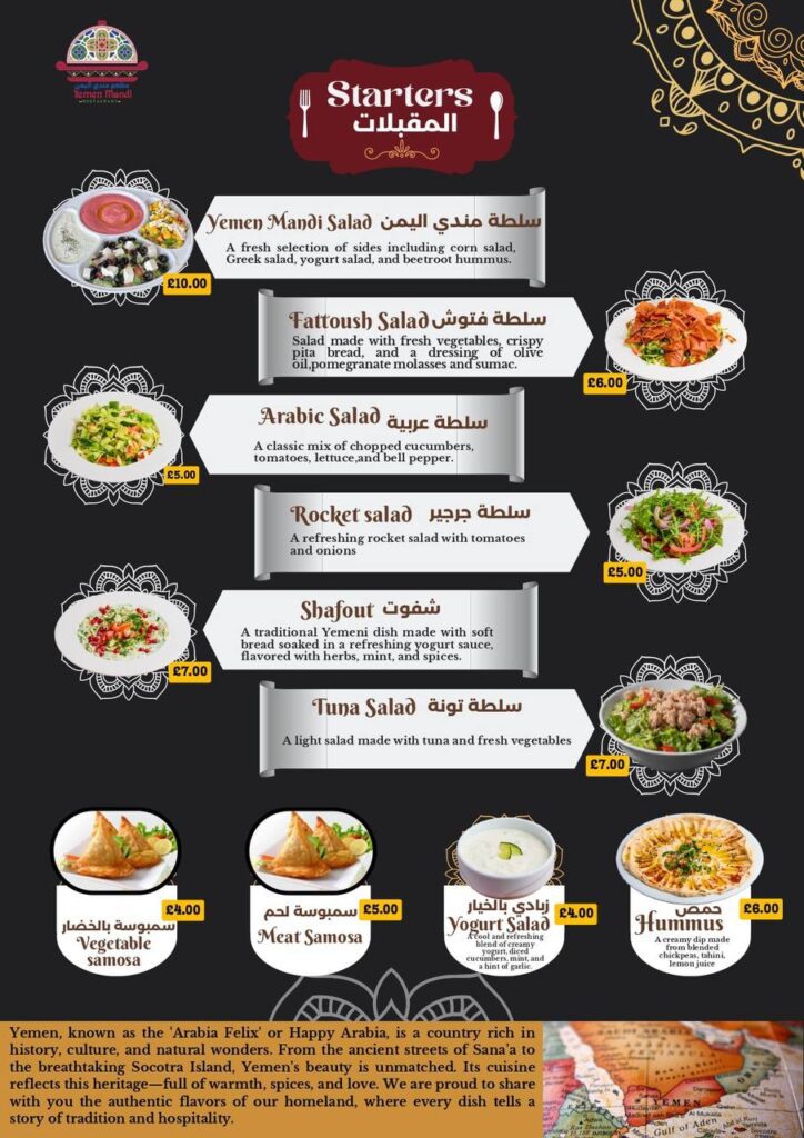 From traditional Mandi and Madhbi to refreshing salads and delicious side dishes, every item is crafted with care and fresh ingredients. Explore our variety of options that cater to all tastes, and enjoy a true taste of Yemen!